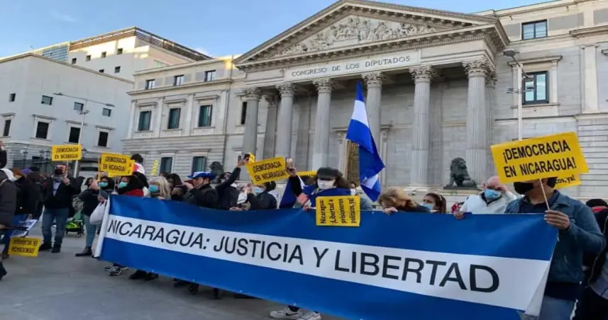 "Democracia ya en Nicaragua", "Nicaragua, justicia y libertad", entre otros lemas, se leía en diferentes pancartas durante la protesta en la capital de España, en la que participaron decenas de personas frente al Congreso de los Diputados, Cámara baja del Parlamento español.