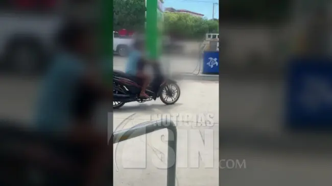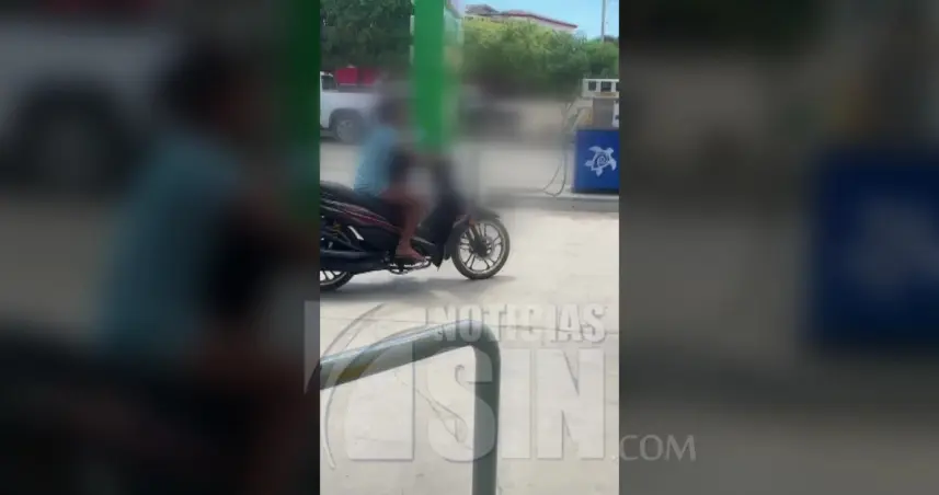 En un video que llegó al Whatsapp de SIN, se observa a la menor de edad estacionarse en una bomba de gasolina a echar gasolina, con el pequeño en brazos, posteriormente se monta, sienta al niño entre sus piernas en el transporte y se va.