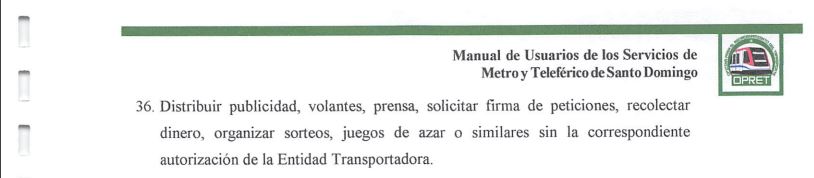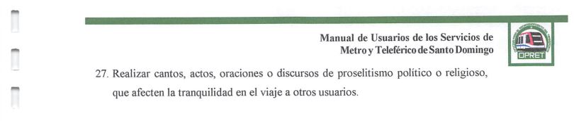 El Manual de Usuarios de los Servicios de Metro y Teleférico de Santo Domingo, establece que no está permitido "realizar cantos, actos, oraciones o discursos de proselitismo político o religioso, que afecten la tranquilidad en el viaje a otros usuarios".