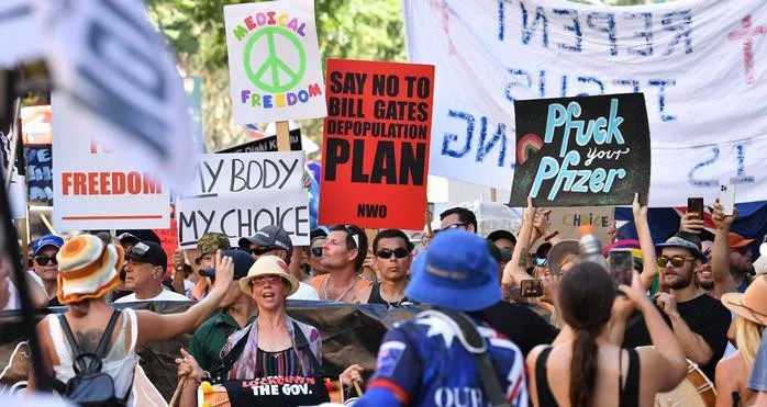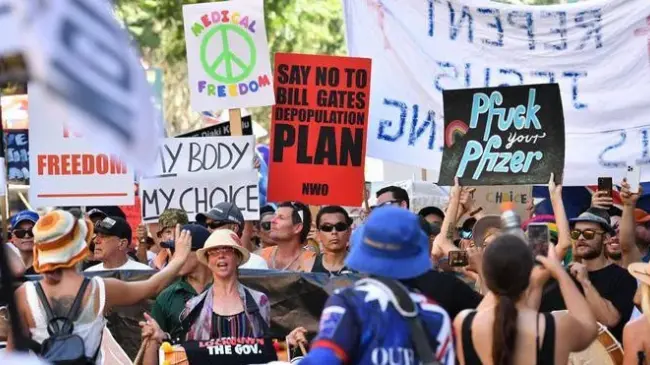 En el centro de la ciudad de Melbourne, en el estado de Victoria, más de mil personas se concentraron de manera pacífica con banderas australianas y pancartas en contra de la vacunación y las restricciones por la covid-19, mientras gritaban lemas como "mi cuerpo, mi decisión".