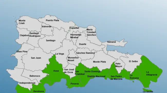 Las provincias en alerta verde son: Santo Domingo, Distrito Nacional, Pedernales, Barahona, San Cristóbal, Paravia, Azúa, La Romana, San Pedro de Macorís y La Altagracia.