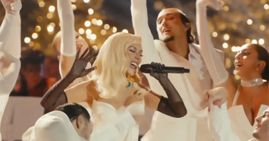 Aguilera está acompañada por una orquesta de cámara y de un grupo de bailarines vestidos de blanco, el mismo color que el corpiño que luce.