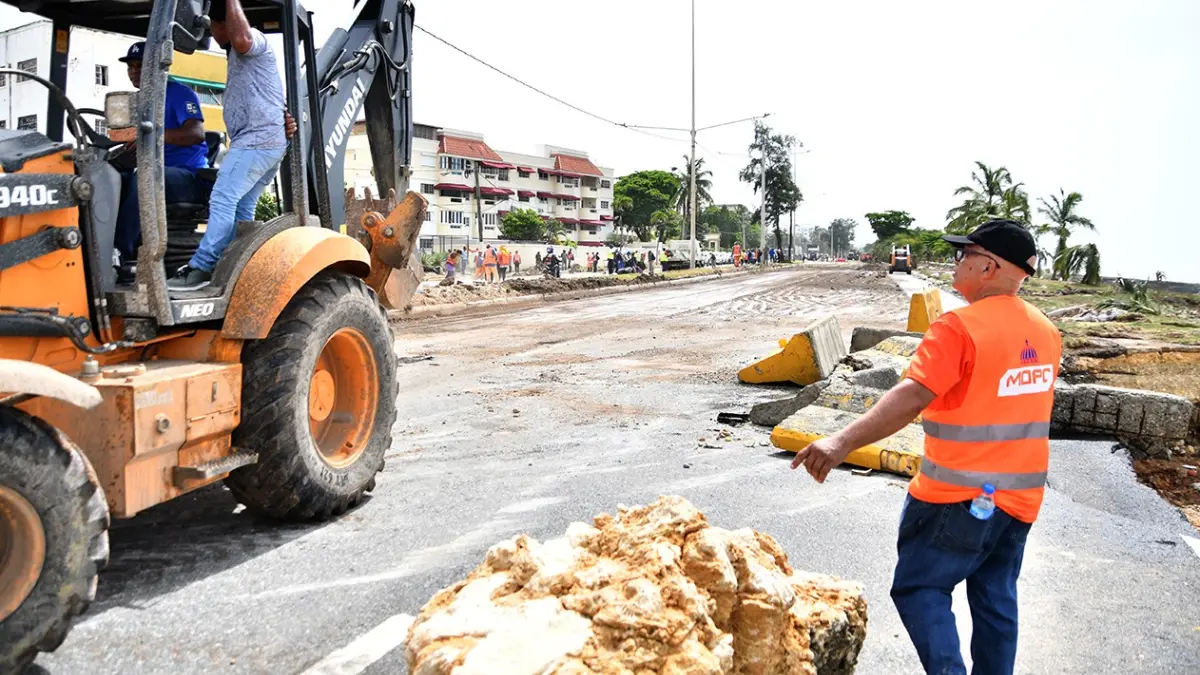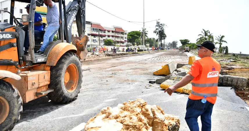 Las brigadas del MOPC laboran con palas mecánicas, retroexcavadoras, camiones tipo volteo, y volquetas, para recoger los escombros arrojados en esa importante vía por los fuertes oleajes provocados por el huracán Beryl en su trayectoria por el mar Caribe.