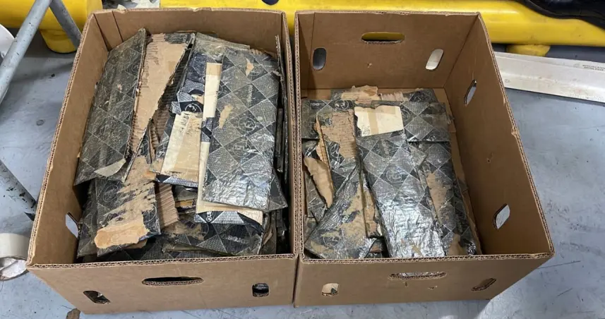 En presencia del fiscal, se procedió a realizar una revisión más exhaustiva, ocupando dentro del contenedor, decenas de cajas cargadas de banano, con un doble fondo, conteniendo en su interior las 97 láminas de la sustancia.