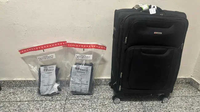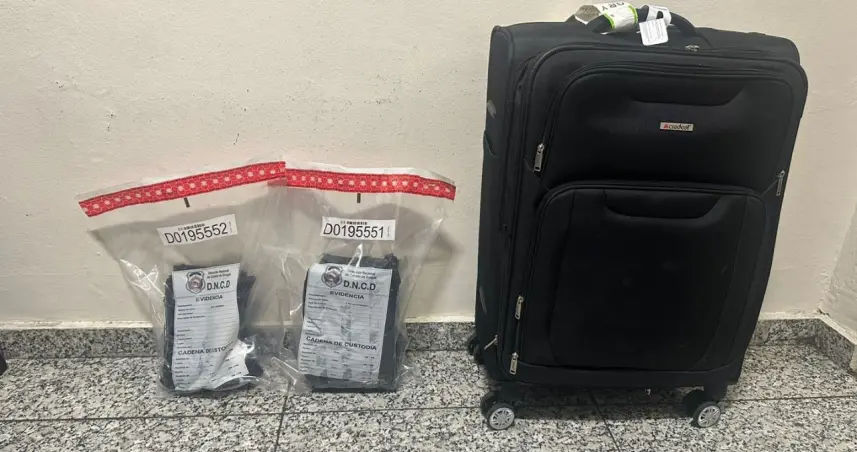 En presencia del fiscal se abrió la maleta, descubriendo dentro un doble fondo, con dos paquetes en forma de láminas, con un peso de (2.35) kilogramos de cocaína,de acuerdo al análisis de los organismos correspondientes.