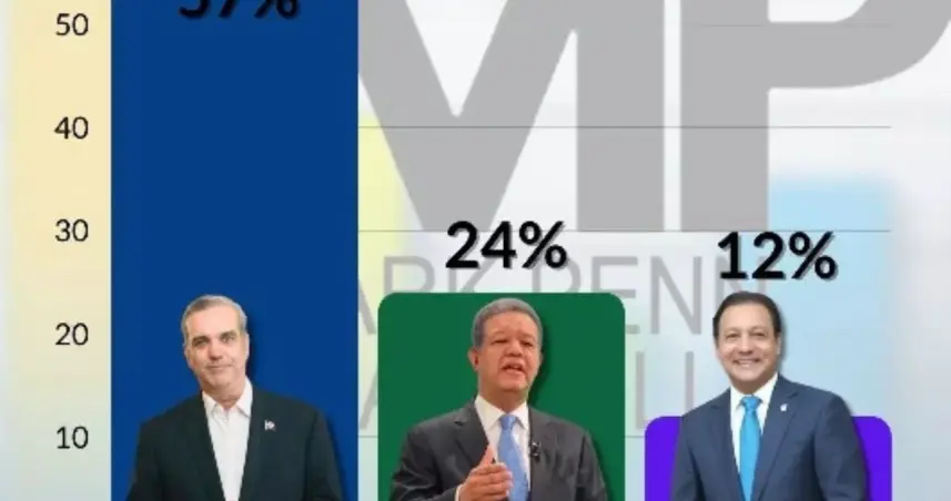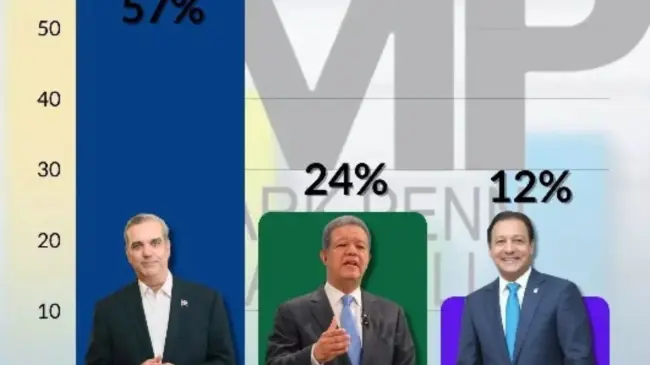 La encuesta, Mark Pen, posiciona al presidente Abinader en el primer lugar, por encima de sus principales competidores con un 57 por ciento, seguido por una gran diferencia de 33 puntos sobre Leonel Fernández, quien solo sacaría un 24%.
