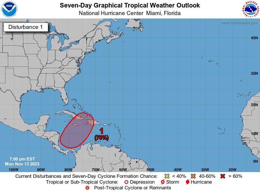 SANTO DOMINGO.- La Oficina Nacional de Meteorología (ONAMET) recomendó a la población estar atenta al seguimiento y evolución del fenómeno atmosférico de baja presión en formación sobre el suroeste del mar Caribe, ya que tiene un 60 por ciento de probabilidad de convertirse en ciclón tropical y generar precipitaciones en los próximos 7 días.