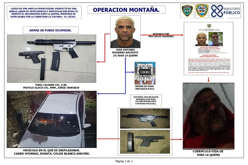 Santo Domingo.– Santo Domingo.- “Operación Montaña”, así se denomina el operativo policial que abatió al presunto microtraficante José Antonio Figuereo Bautista, reconocido como “Kiko la Quema” la noche del pasado viernes en la carretera Los Cacaos, municipio de Cambita Garabito, provincia San Cristóbal.