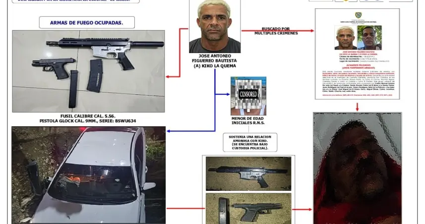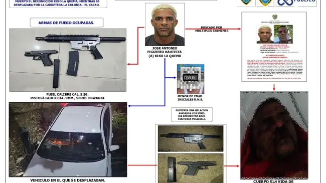 Una nota de prensa de la Policía, indica que José Antonio Figuereo Bautista (Kiko la Quema) enfrentó a los miembros de la institución del orden con un fusil marca no visible, negro con gris, y la pistola marca Glock, calibre 9mm, No. BSWU634, negro, con un cargador para 30 cápsulas, calibre 9mm, que portaba de manera ilegal.