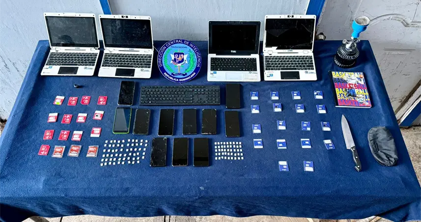 - En el primer operativo, efectuado en cumplimento de la orden judicial No. 2025-AJ0084529, en una residencia ubicada en el sector Cienfuegos, fueron detenidas tres personas, a quienes se les ocuparon 11 celulares, 4 laptops, un teclado, 123 tarjetas SIM de distintas compañías telefónicas, una hookah y un arma blanca, presuntamente utilizados para cometer delitos electrónicos a través de la web.