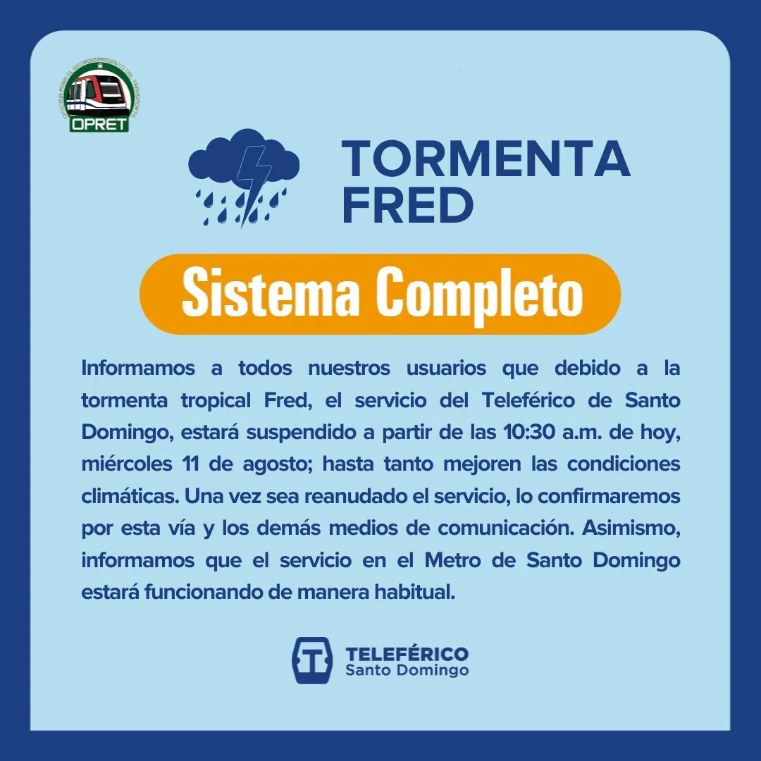 Mediante un comunicado indicó que el servicio estará suspendido hasta que mejoren las condiciones climáticas. Añadió que el Metro de Santo Domingo funcionará de manera habitual.“Una vez sea reanudado el servicio, (del Teleférico) lo confirmaremos de manera inmediata por Twitter y los demás medios de comunicación”, resaltó.