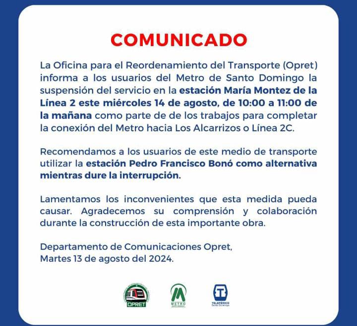 Santo Domingo.– Santo Domingo.- La Oficina para el Reordenamiento del Transporte (Opret) informó que suspenderá el servicio en la estación María Montez de la Línea 2 este miércoles 14 de agosto, en el horario de 10:00 a 11:00 de la mañana, como parte de los trabajos para completar la conexión del Metro hacia los Alcarrizos o Línea 2C.