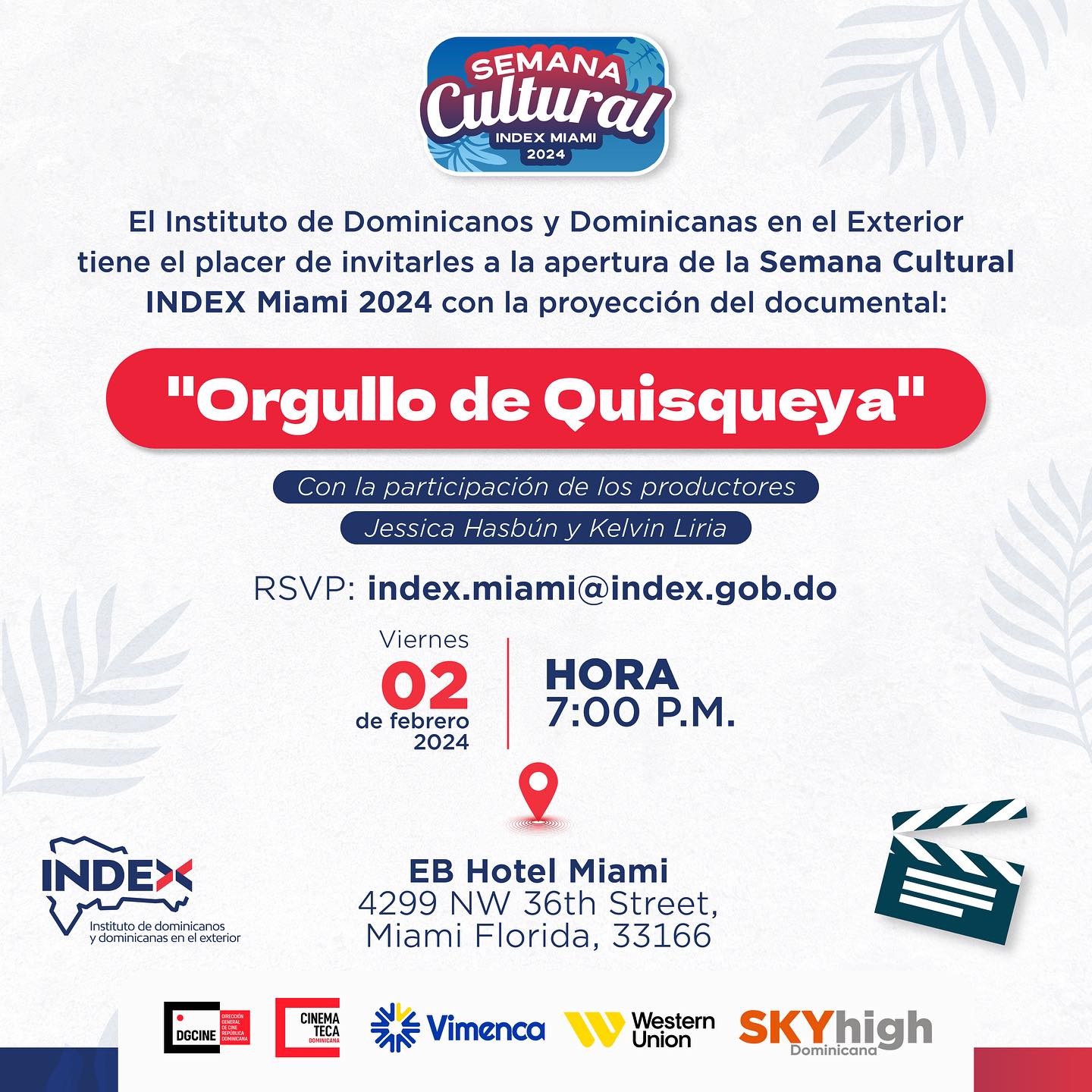 Miami.– MIAMI.- El Instituto de Dominicanos y Dominicanas en el Exterior (INDEX) anunció que el documental “Orgullo de Quisqueya”, producido por la periodista Jessica Hasbún y el creador Kelvin Liria, abrirá la Semana Cultural INDEX en la ciudad de Miami, Estados Unidos.