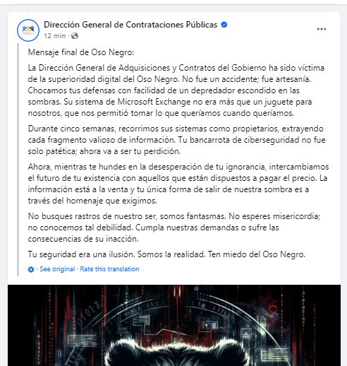 En un mensaje más extenso que se visualiza en la página de Facebook de la entidad, el hacker resalta que la "Dirección General de Adquisiciones y Contratos del Gobierno ha sido víctima de la superioridad digital del Oso Negro".