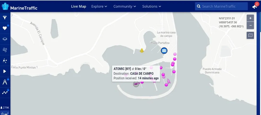 Se trata del lujoso yate con la bandera de las Isla Caimán "Atomic" el cual se encuentra anclado actualmente en Casa de Campo, provincia La Romana, según Marine Traffic.