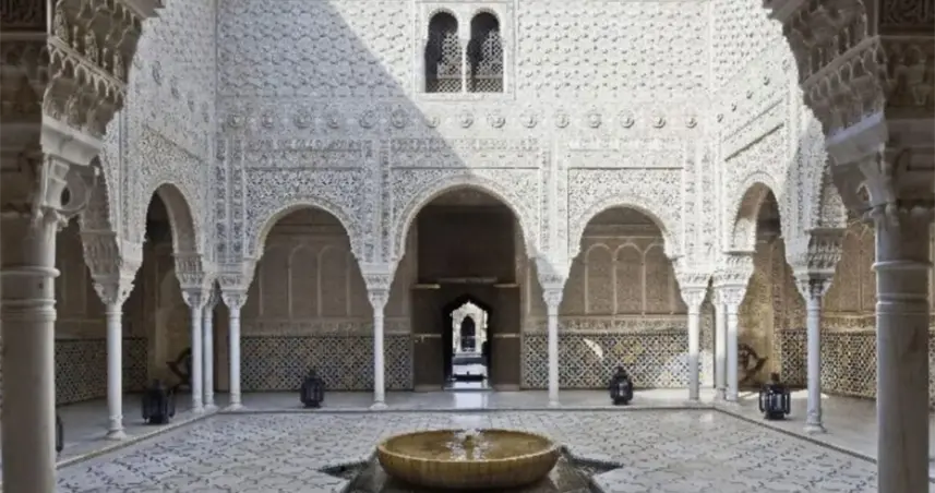 El artículo muestra una galería de fotos de la propiedad, identificada como Bin Najil, construida en un recargado estilo tradicional marroquí, en la que no faltaban una piscina y un jardín con una pérgola. Hasta 1,300 artesanos habían trabajado en su construcción y decoración.