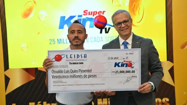 Santo Domingo.– Santo Domingo.- La Lotería Electrónica Internacional Dominicana (Leidsa), anunció que el joven Osvaldo Luis Quiro Pimentel, fue el ganador de 25 millones de pesos en el sorteo del Super Kino tv, en el sorteo realizado el pasado 26 de marzo del año en curso.