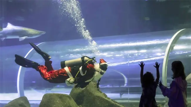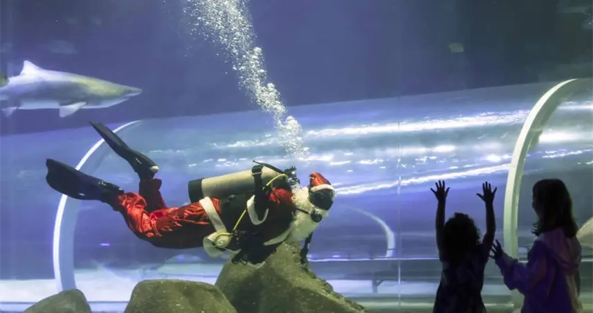 Santa Claus se sumergió con sus asistentes en las aguas del tanque de los escualos para montar un árbol de Navidad y dejar unos cuantos regalos luminosos en el fondo.