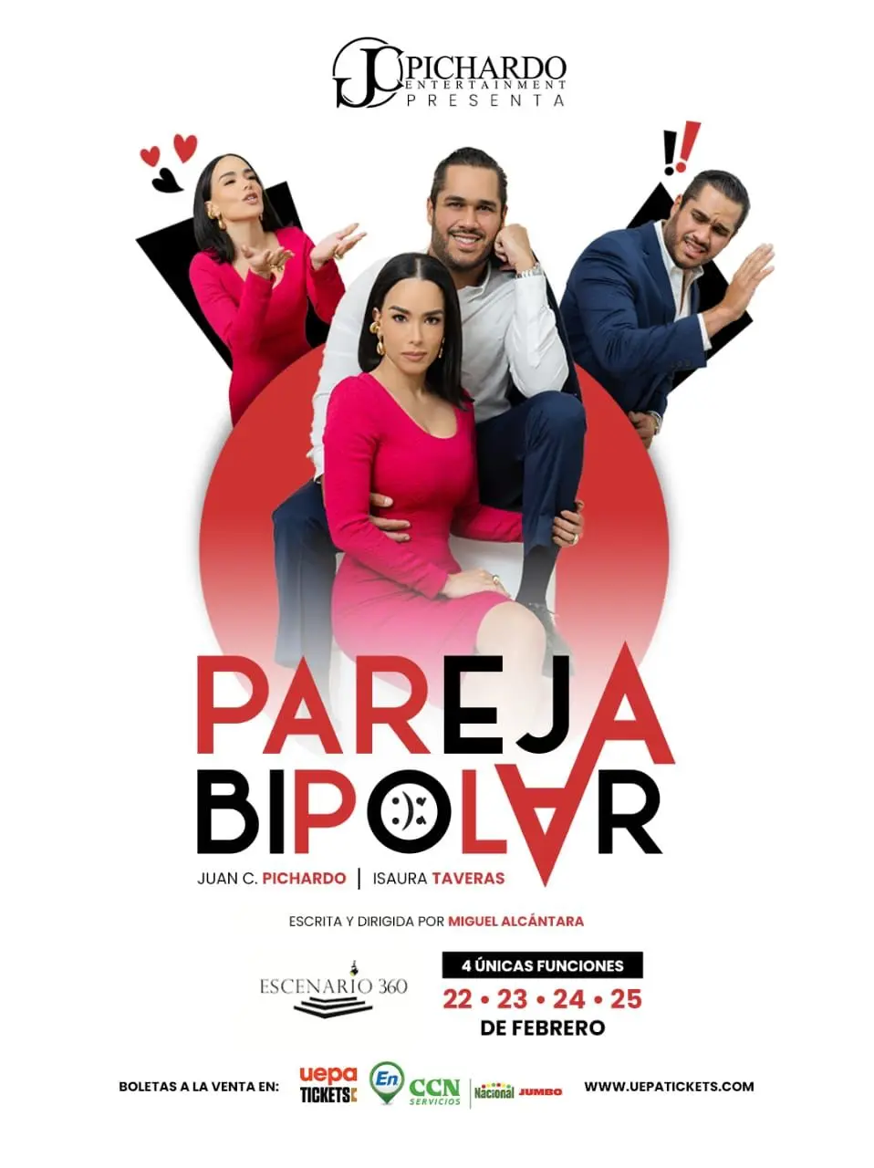 “Pareja Bipolar” será presentada en Escenario 360 los días 22, 23, 24 y 25 de febrero a partir de las 8:00 de la noche con entradas disponibles desde ya en Uepa Tickets CCN Supermercados Nacional Jumbo, bajo la producción de JC Pichardo Entertainment.