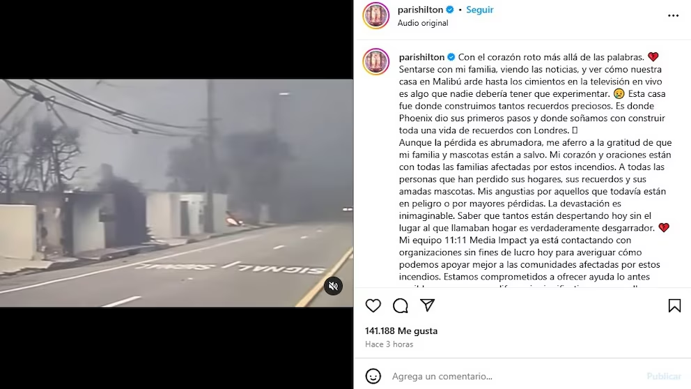 “Estoy aquí, en lo que solía ser nuestro hogar, y la desolación es realmente indescriptible”, escribió Hilton en su publicación. “Cuando vi las noticias por primera vez, estaba en completo shock; no podía procesarlo. Pero ahora, al estar aquí y verlo con mis propios ojos, siento que mi corazón está roto en un millón de pedazos”.