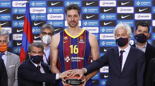 Durante su parlamento, Laporta recordó a Gasol que lo ha ganado todo como jugador, pero le falta un título "y todos sabemos cuál es", le apuntó, animándole a conseguirlo esta temporada.