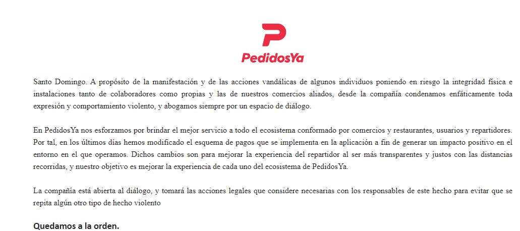 Santo Domingo.– SANTO DOMINGO.- Ante la manifestación de un grupo de personas que se dedican al servicio de delivery por medio de la aplicación Pedidos Ya, y que, según videos vandalizaron la oficina física de esa plataforma, la compañía emitió un comunicado en el que advirtió que tomará las acciones legales que considere necesarias en contra de los responsables de causar alegados daños a la estructura.