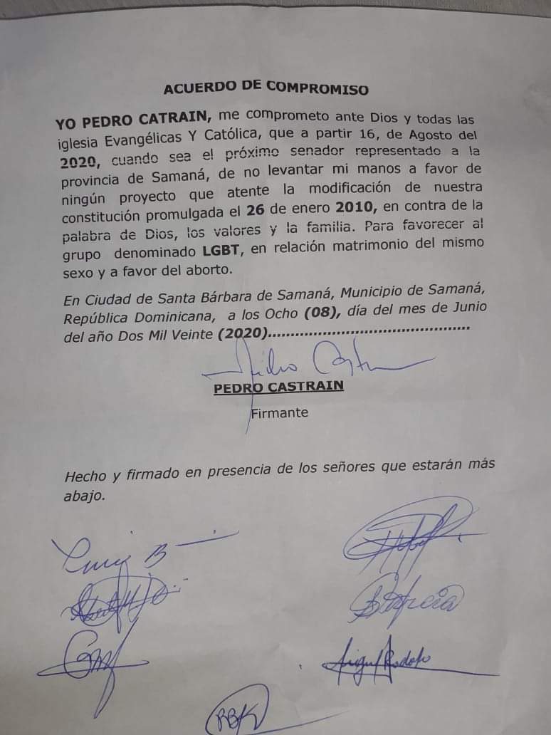 "Me comprometo ante Dios y todas las iglesias evangélicas y católica, que a partir del 16 de agosto 2020, cuando sea el próximo senador representado a la provincia de Samaná, de no levantar mis manos a favor de ningún proyecto que atente la modificación de nuestra Constitución promulgada el 26 de enero 2010, en contra de la palabra de Dios, los valores y la familia, para favorecer al grupo denominado LGBT, en relación al matrimonio del mismo sexo y a favor del aborto", dice el documento firmado por Catrain.