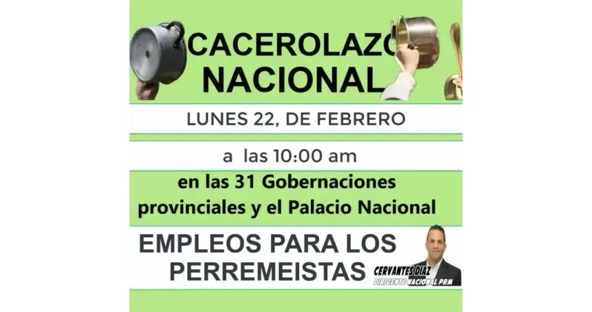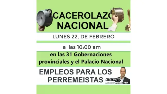 Santo Domingo.– SANTO DOMINGO.- Miembros del Partido Revolucionario Moderno anunciaron para el lunes 22 de febrero el "Cacerolazo Nacional" en reclamo de empleos para los perremeistas.