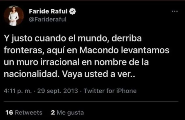 El 29 de septiembre de 2013, la actual senadora del Distrito Nacional, Faride Raful (@Farideraful) tuiteó “Y justo cuando el mundo, derriba fronteras, aquí en Macondo levantamos un muro irracional en nombre de la nacionalidad. Vaya usted a ver”.
