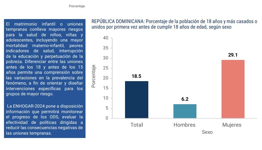 Santo Domingo.- Pese a la aprobación de la Ley 1-21 en 2021, que prohibió el matrimonio infantil en República Dominicana, las uniones tempranas relaciones informales o formales con personas menores de 18 años siguen siendo un desafío crítico, según los datos de la Encuesta Nacional de Hogares (ENHOGAR-2024), revelados a finales de marzo por la Oficinal Nacional de Estadística.
