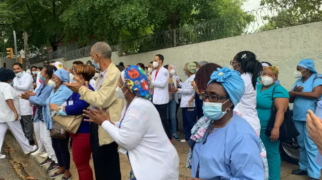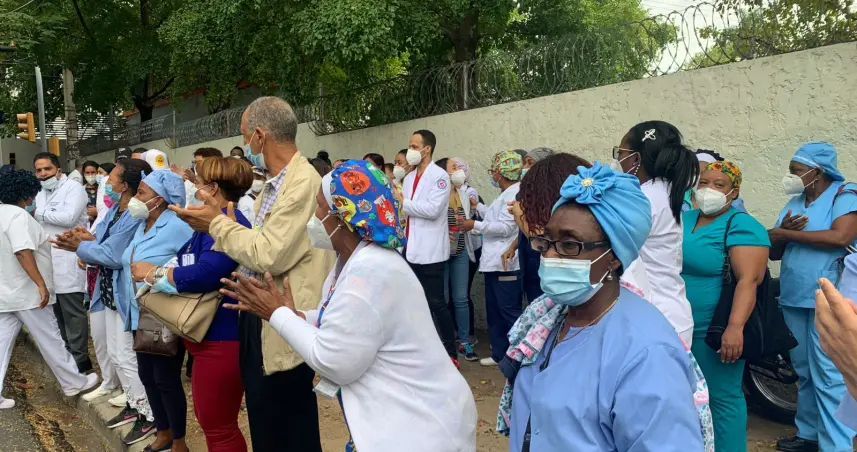 Santo Domingo.- Representantes de todas las áreas de salud del Colegio Médico Dominicano (CMD) exigen frente a las instalaciones del Servicio Nacional de Salud (SNS) el pago atrasado de 1,100 trabajadores de nómina correspondiente al mes de enero.