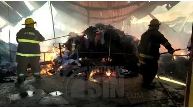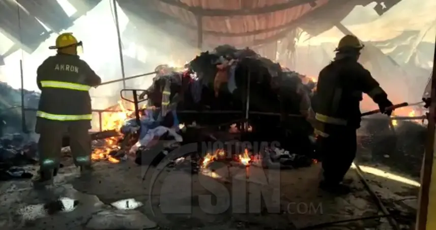 SAN PEDRO DE MACORÍS.- Bomberos continúan sofocando el incendio en la fábrica de ropa de pacas que de acuerdo a los empleados que fueron evacuados, inició alrededor las 6 de la mañana.