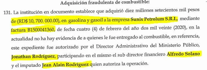 Según la acusación del MP “en la actualidad no hay evidencias de a quienes le fueron entregados el combustible, en referencia, este expediente fue autorizado por el director Administrativo del Ministerio Público, Jonathan Rodríguez, participando en el mismo el subdirector financiero, Alfredo Solano y el imputado Jean Alian Rodríguez, quien autoriza la operación”.