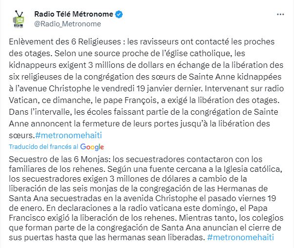 REDACCIÓN.– Redacción.- Según, la emisora radial haitiana, Radio Metronome, los secuestradores de seis monjas en Puerto Príncipe el pasado 19 de enero, pidieron a los familiares de las víctimas tres millones de dólares para su liberación.