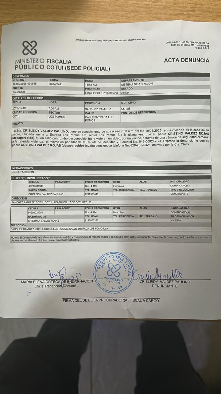 Para cualquier información que pueda ayudar a dar con el paradero de Cristino Valdéz, favor comunicarse a los teléfonos 829-517-0023 o 849-447-2284.