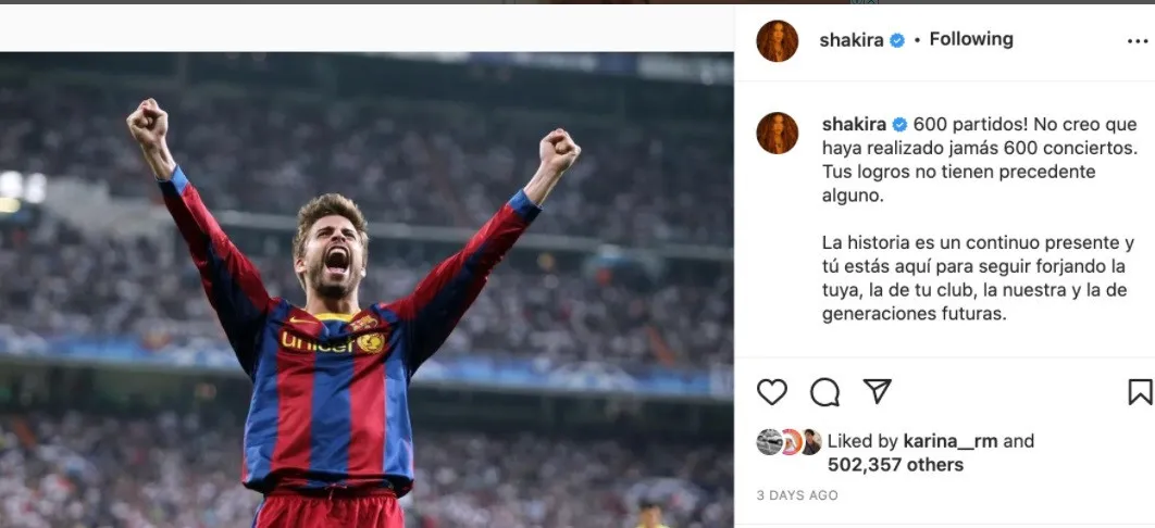 ¡Lo mejor fue lo que la colombiana hizo después! Colgó esta foto triunfal del padre de sus hijos para celebrar la última victoria de su club y marcar un hito: el éxito de su amado Piqué en su partido número 600: