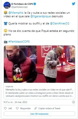 El jugador holandés Memphis Depay compartió un vídeo grabado en el vestuario del Barça tras el partido ante el Osasuna. "Mucho flow", escribieron en el mensaje que se vio encima. Aunque, en lo que todos se fijaron era en lo que se veía al fondo: Gerard Piqué totalmente desnudo.