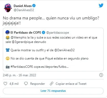Aunque Depay trató de borrar enseguida el video, ya los fans habían acaparado las imágenes. "No drama ma people… quien nunca viu un umbligo? jajajajaja!!", dijo Alves.