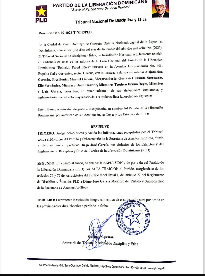 Santo Domingo.– SANTO DOMINGO.- El Partido de la Liberación Dominicana (PLD) expulsó de sus filas al candidato del Colegio de Abogados, Diego José García por alta traición, luego de la controversia que ha generado sus declaraciones de que Yohan López ganó la presidencia del Colegio de Abogados de la República Dominicana (CARD).