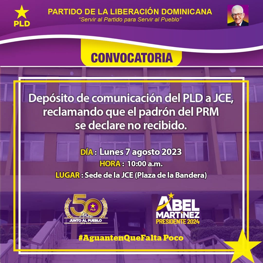 Santo Domingo.– SANTO DOMINGO.-El Partido de la Liberación Dominicana (PLD) depositará una comunicación ante la Junta Central Electoral (JCE) solicitando que sea declarado no recibido el padrón del Partido Revolucionario Moderno (PRM).