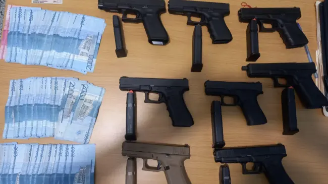 Al momento de la detención de Jerinson y ser requisado, se le ocupó una mochila que contenía en su interior ocho armas de fuego sin documentos, todas marca Glock, dos son modelos 19, una serie No. BHUC283 y otra 4ta. Generación, serie No. AETP900, además otra modelo 17, 5ta generación, series Nos. L124226 y AHLA814.
