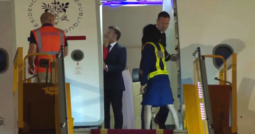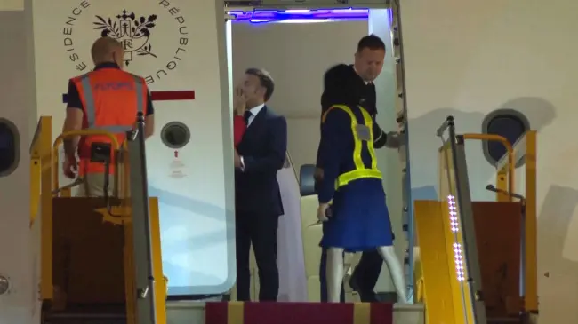 En el audiovisual se ve cómo se abren las puertas del avión y el personal de tierra se coloca a ambos lados de la puerta para facilitar su salida. En ese momento, Macron saluda a las personas que estaban esperándole a su llegada y justo los brazos de su esposa aparecen en plano.