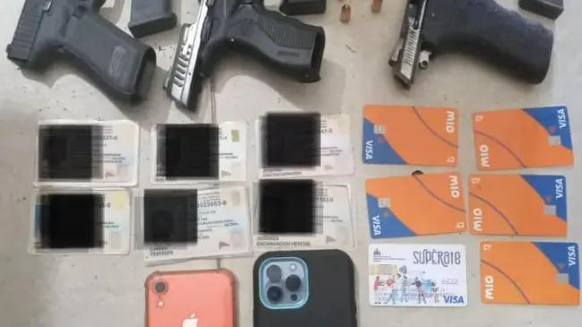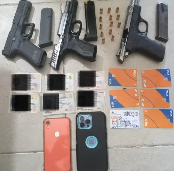 El informe policial indica que, al momento de su detención, los individuos se trasladaban en un automóvil marca Hyundai, modelo Sonata, color gris, por el tramo carretero Habanero-Barahona. Los agentes ocuparon en el interior del vehículo tres pistolas de diferentes marcas, calibre 9 mm, con 13 cápsulas, así como tres celulares, seis cédulas, cinco tarjetas del banco Banreservas y una tarjeta del programa "Súperate".