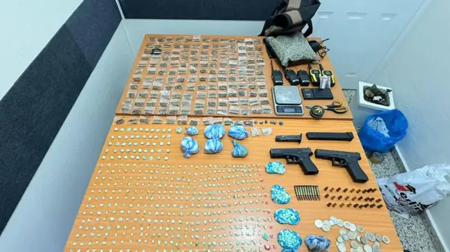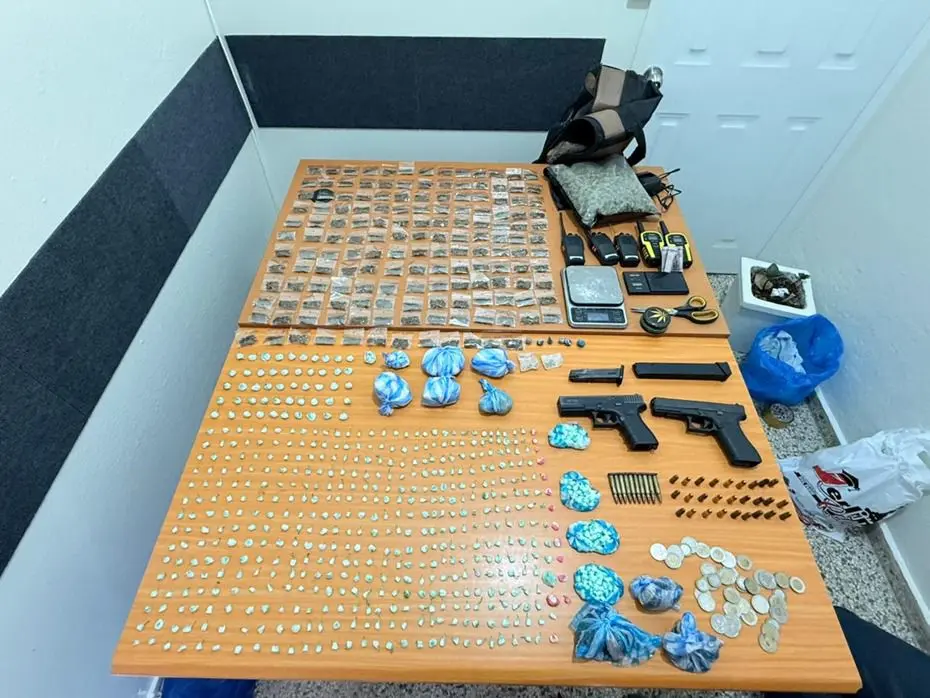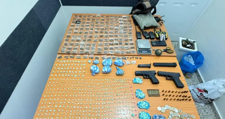 Además, se incautaron dos armas de fuego en condición ilegal, ocho radios de comunicación, tres balanzas digitales, cápsulas para diversos calibres, un teléfono celular y 3,000 pesos en monedas.