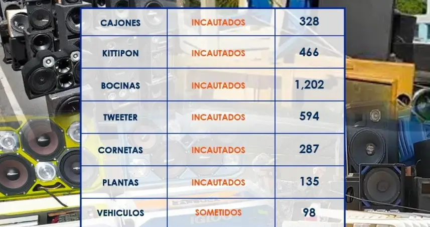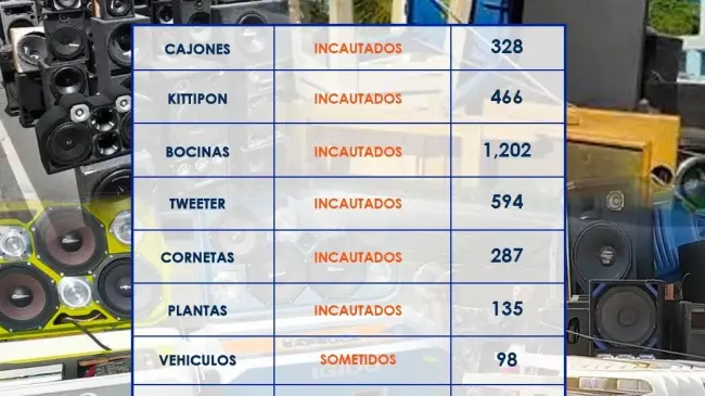 Policía ocupa más de 3,000 bocinas, cajones, kitipó y otros equipos electrónicos