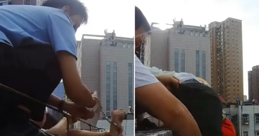 Cuando subió al tejado, el oficial Li Yansong decidió esposarse el mismo a Chen en lugar de esposarlo a una barandilla cercana, mientras que otro oficial lo agarró de la muñeca para evitar que ambos cayeran.