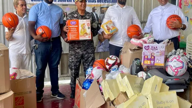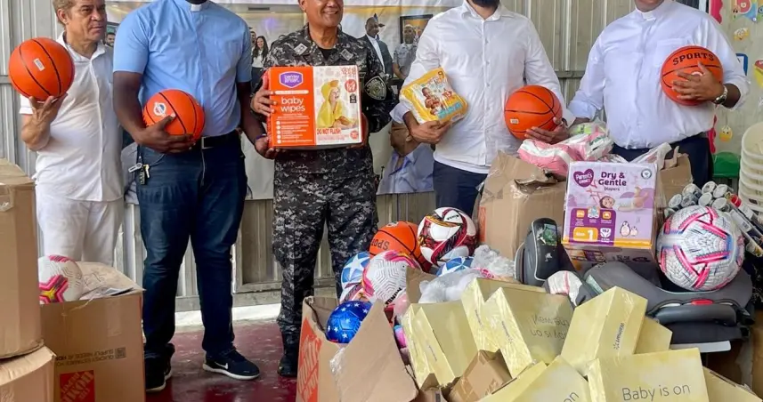 El director de Deportes de la institución del orden, general Jacobo Mateo Moquete, entregó en la Parroquia de Las Cañitas útiles deportivos, escolares y del hogar a los sacerdotes de los sectores antes mencionados, artículos donados por la Fundación GÜIRIBITEY, de Miami, Florida.