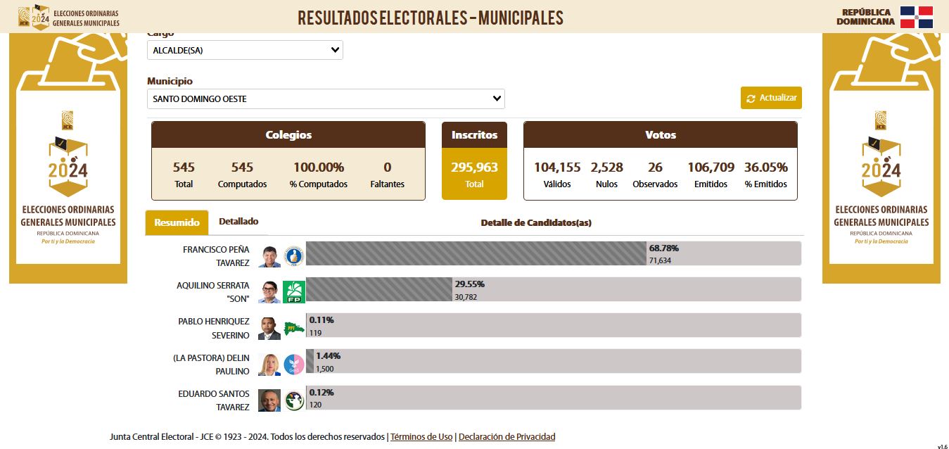 Santo Domingo.– SANTO DOMINGO.- Tras ganar las elecciones municipales en Santo Domingo Oeste por el Partido Revolucionario Moderno (PRM) con un 68.78%, Francisco Antonio Peña Tavarez, vuelve a liderar dicha alcaldía por cuarta vez.