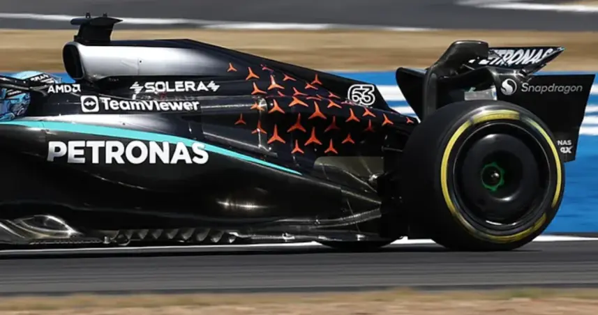 En Silverstone, Mercedes-AMG también incluyó estrellas naranjas en sus monoplazas como un guiño al futuro, reflejando el color de los prototipos C111 usados para innovar en tecnología automotriz.
