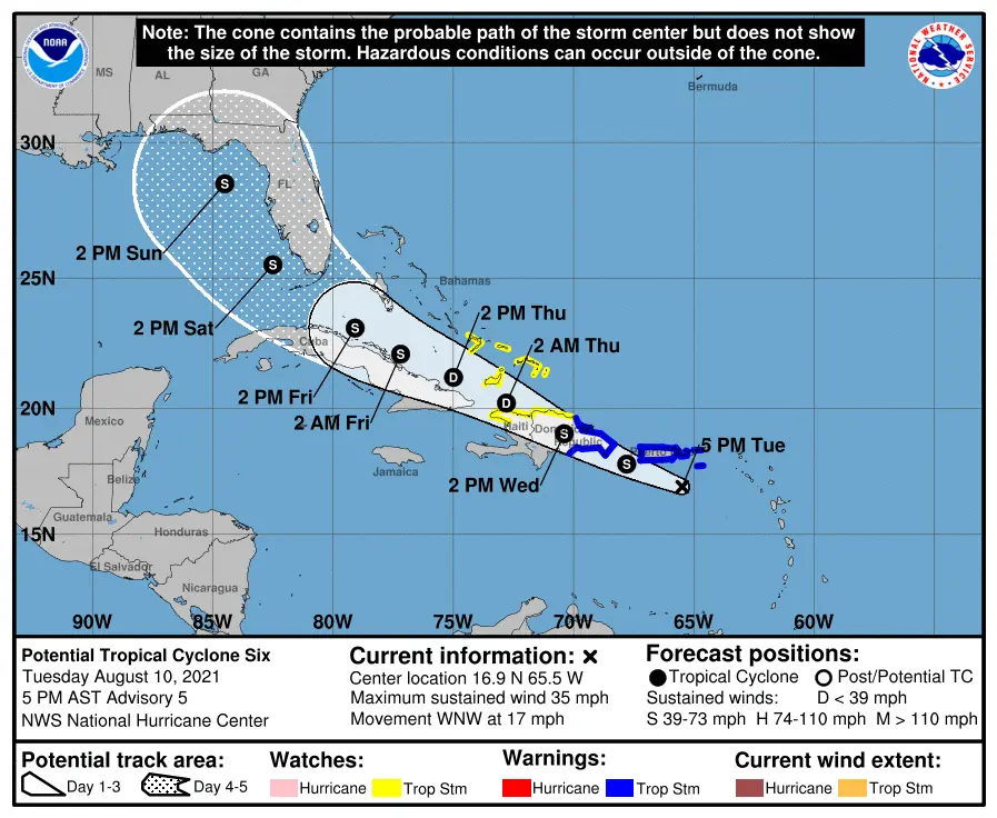 Los meteorólogos del NHC pronostican su "fortalecimiento gradual durante las próximas 24 horas y se espera que la perturbación se convierta en tormenta tropical esta tarde o noche", para luego debilitarse al interactuar con La Española, en el Caribe.